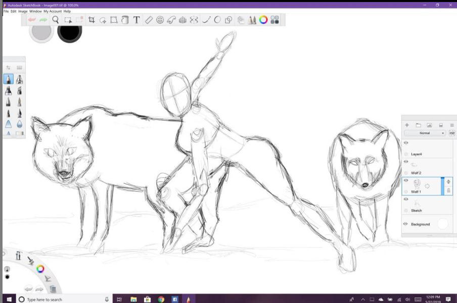 Rough Sketch - Action scene of a woman warrior and her wolves